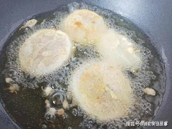 11、等待油温5-6成热时,下入萝卜夹,教大家一个小窍门,把筷子插到锅底,周围有密集气泡冒出,表示即可下锅,一定要小火慢炸,中间多翻动几次。