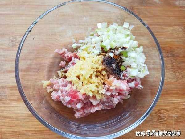 5、五花肉泥中,加入葱姜末,1勺老抽,1勺料酒,1勺食盐,1勺味极鲜,充分的搅拌均匀,腌制入味。