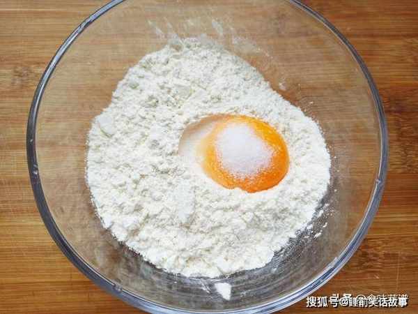 7、碗中加入100克面粉,40克土豆淀粉,1勺盐,再打入1个蛋黄,边倒清水边搅拌。