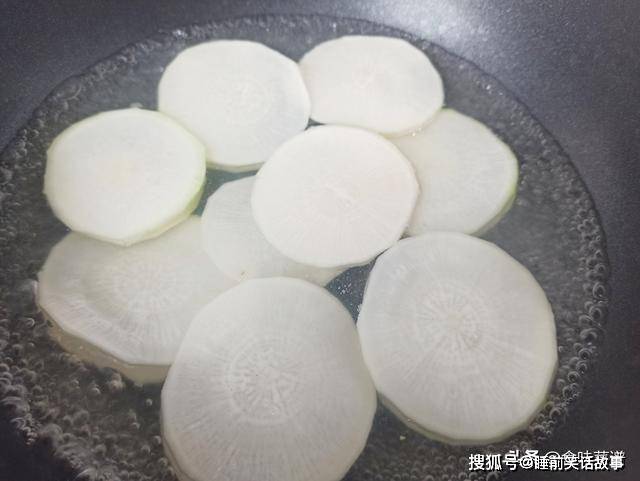 3、把切好的萝卜片,放在开水中,焯烫1分钟左右,捞出来控干水分。