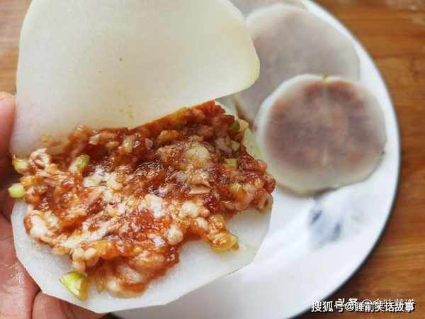 9、准备工都做好之后,把腌好的肉泥,夹到萝卜片里面,按压紧实。