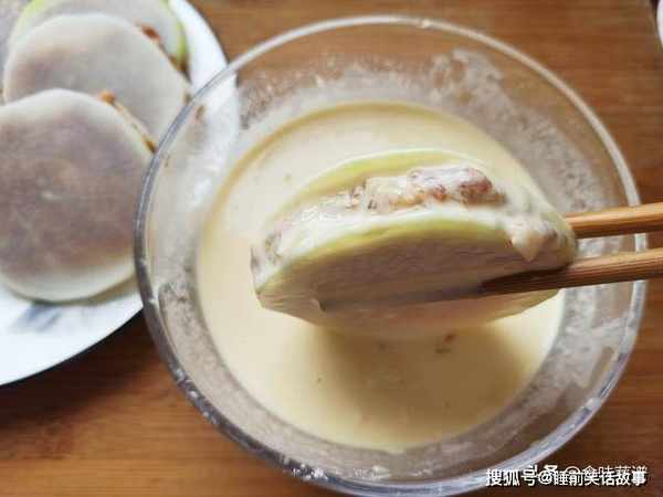10、把做好的萝卜夹,裹上一层面糊,左右裹匀实一些。