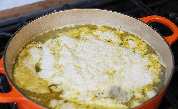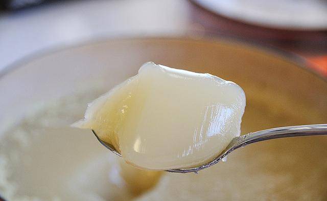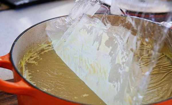 第二天:把汤从冰箱取出,这个时候汤已经变成膏状,汤的油渍应该附在了保鲜膜上,将保鲜膜移除丢弃,用一个调羹将表面的油再仔细刮干净,放回炉子继续用大火煮开后,放入打散的蛋清,倒入蛋清的时候,要一边倒入一边搅拌汤水,那样蛋清会裹住汤里的混浊之物,等到蛋清烧老,撩起弃去(若是用细纱布袋来过滤也行),熄火,你的极品高汤此时就大功告成了.(大约12杯)