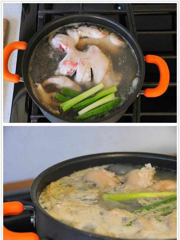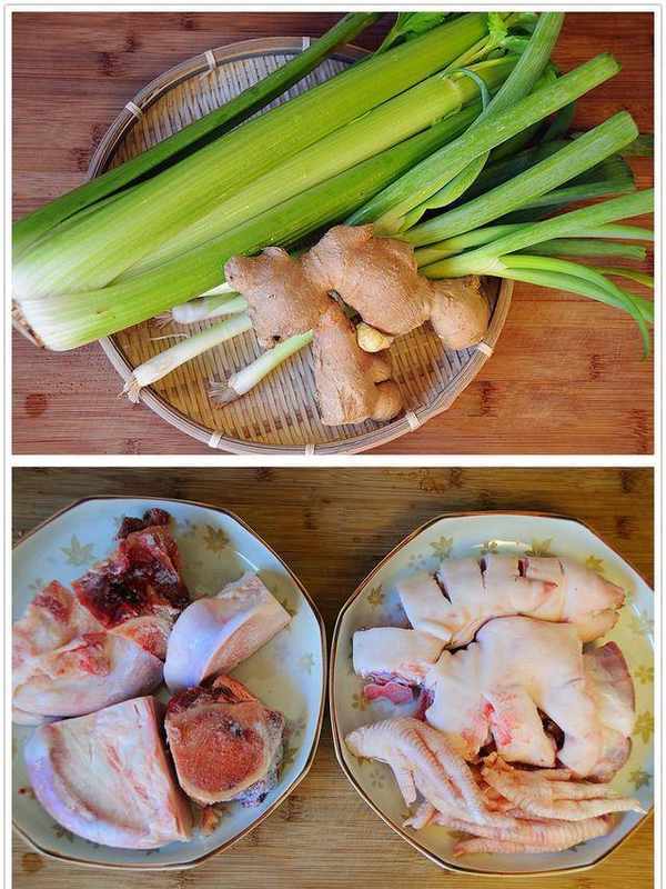 第一天:先煮一锅清水,沸腾之后将牛骨鸡爪猪脚,姜3片,葱2根放入,煮约5分钟,等到血水都变成咖啡色的肉沫浮到锅面后,将水倒掉,葱姜丢弃,用冷水彻底清洗干净并擦干.