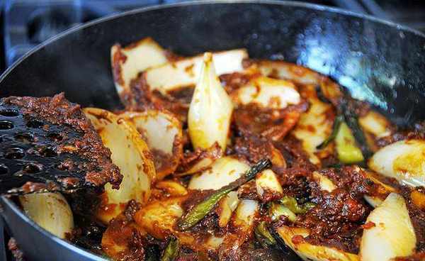 在此同时可以在炒锅里加入3大匙油,7分热后放入葱段,煎炒大约2分钟后加洋葱和大蒜继续炒约2分钟。然后加入所有酱料,炒至香味溢出,大概2~3分钟。把所有的东西包括整条的牛腱和牛筋,移入一个大汤锅内。