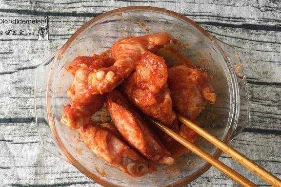 然后,我们将翅中和翅根划几刀,再涂上新奥尔良粉,腌制均匀,然后放到静止10-15分钟。