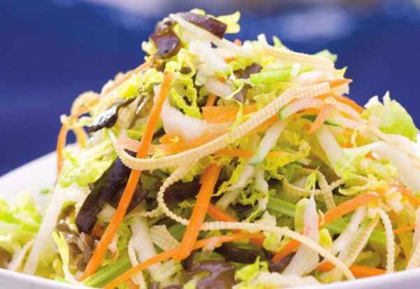 材料:白菜心150克,胡萝卜、水发木耳、干豆腐、黄瓜各50克,蒜末20克,精盐、味精、白糖、香油各适量。