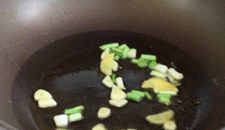 锅里多倒些油,放十几粒花椒,将油烧大热,捞出花椒,再放入葱白、姜和蒜。
