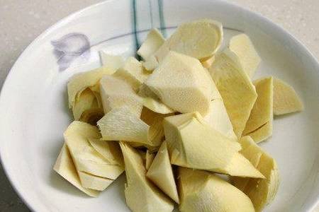 竹笋去壳洗净,切滚刀块,焯水去除草酸。