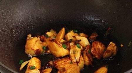 用大火将笋煸微黄,将碗汁倒入锅中快速翻炒,让每一块笋都包裹上酱汁,最后撒上小葱叶即可。