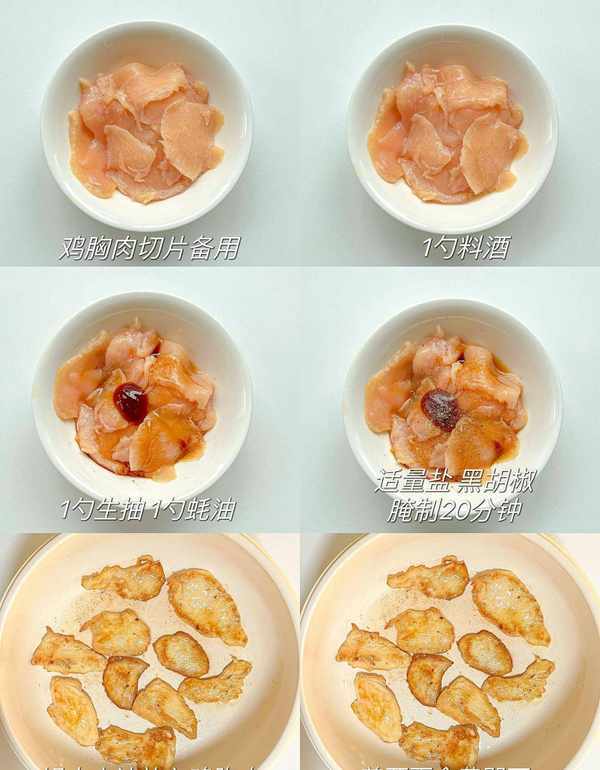 1、鸡胸肉切薄片放碗里,加入1勺料酒,1勺生抽,1勺蚝油,少许的盐和黑胡椒粉,搅拌抓匀腌制20分钟以上,建议大家一次腌制吃3餐以上的鸡胸肉,每天吃1-2餐,腌制的时间越久味道越入味。