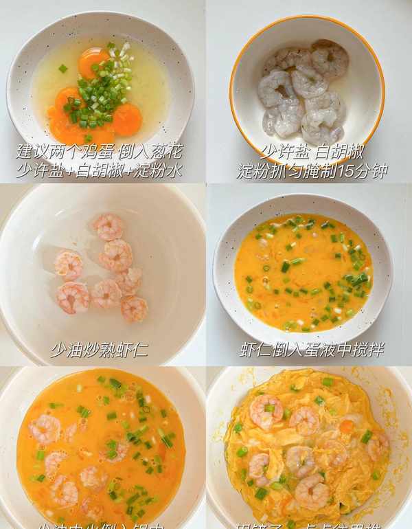 1、虾仁放碗里加入少许白胡椒粉,少许的盐和淀粉,抓匀腌制15分钟左右,腌制虾仁的时候,把2个鸡蛋打入碗里倒入葱花,加入少许的盐,胡椒粉和淀粉水,搅拌成葱花鸡蛋液备用。