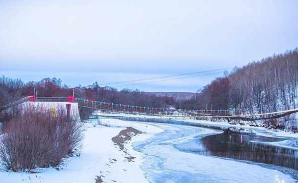 细长的河水缓缓流淌,带着冬天特有的凝固感。沿河树木茂密,让人惊叹于大自然的美丽与神奇。
