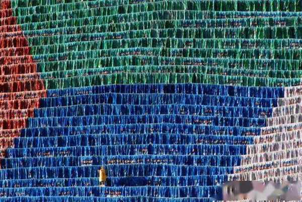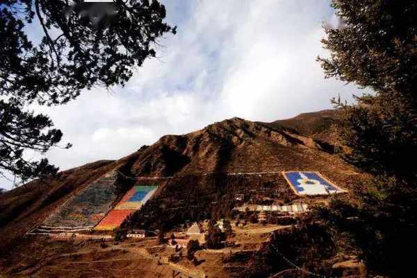 各种颜色的经幡组成了六字箴言的第一个字“嗡”挂在山上,面积约有100多平方米,可以与拉萨大昭寺的大唐卡相媲美!