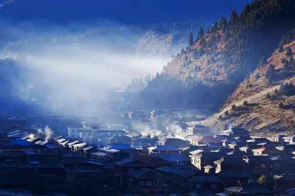 石板藏寨:清晨的石板藏寨很安静,家家户户都生气了炊烟,使得山间烟雾缭绕。