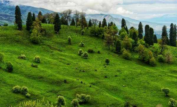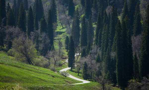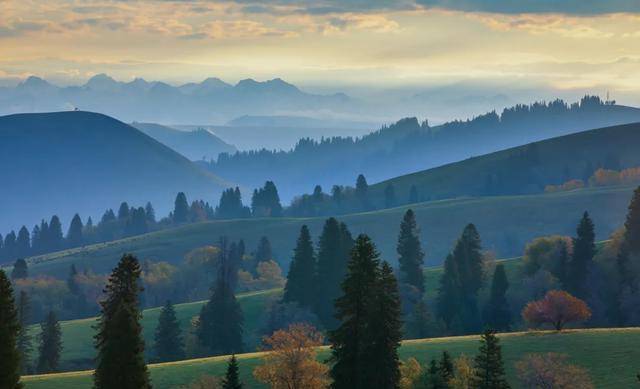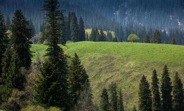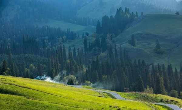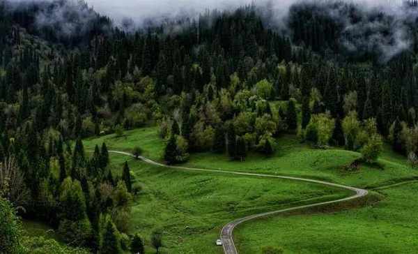 沿山路在绿色的山谷里蜿蜒穿行,盘龙谷道与沿途美景两者浑然一体,如龙若蛇而行,逐渐走高,连绵缓坡,云杉挺拔,苍翠色浓,木疏落,散布路旁。