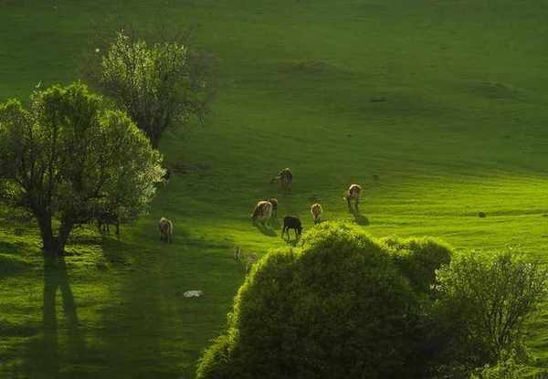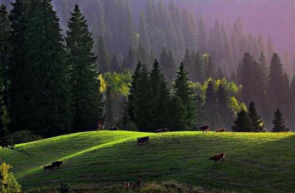 草原清风迎面扑来,太阳从一道道青山间升起,把盘龙谷道刷成了金色,在这宁静的幽谷里,该是一种至真至善的纯朴生活。