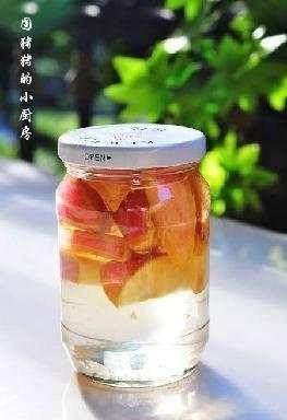2.将苹果片与冰糖一层压一层放于大玻璃瓶,保证每层间有较大间隙,冰糖的量要控制,冰糖的量要低于苹果的一半,具体比例个人把握,