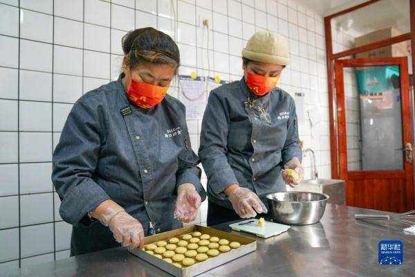 在北京市密云区金叵罗村的西口研食社内,刘甜恬(右)和“三嫂子”杨红艳一起制作小米酥(2022年10月20日摄)。
