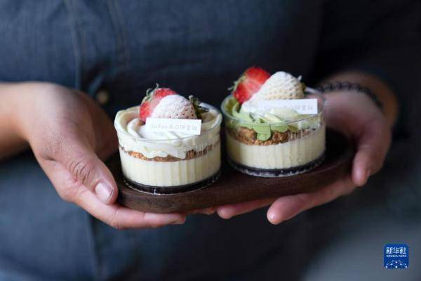 在北京市密云区金叵罗村的西口研食社内,杨甜恬展示自己使用了小米作为原料之一制作的新品小米布丁(2023年3月7日摄)。
