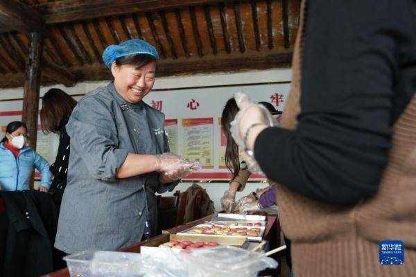 2021年底,来金叵罗村创业的刘甜恬在村西口开了一家甜品店,取名“西口研食社”,店里特色产品是她就地取材研发的“小米酥”,店里的员工也是她培训的本村大姐“三嫂子”杨红艳。