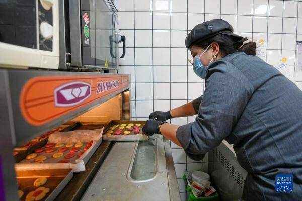 在北京市密云区金叵罗村的西口研食社内,杨甜恬在烤制客人制作的小米酥(2023年3月7日摄)。