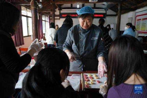 在北京市密云区金叵罗村,“三嫂子”杨红艳在为来村参观并进行小米酥制作体验的客人示范小米酥制作(2023年3月7日摄)。