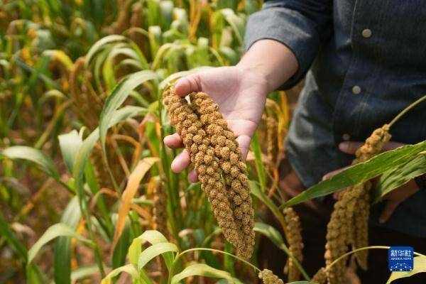 在北京市密云区金叵罗村的谷子地里,刘甜恬展示饱满的谷穗(2022年9月28日摄)。