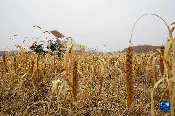 在北京市密云区金叵罗村的谷子地里,农民驾驶农机进行收割(2022年10月20日摄)。