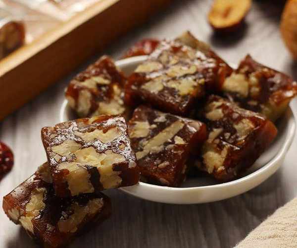 核桃糕俨然已是新年糖的固定班底,然而它的制作过程并不简单,需将黑枣以文火慢炒,才能制成香气浓郁、润而不湿的枣泥;