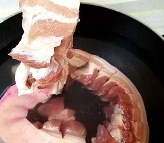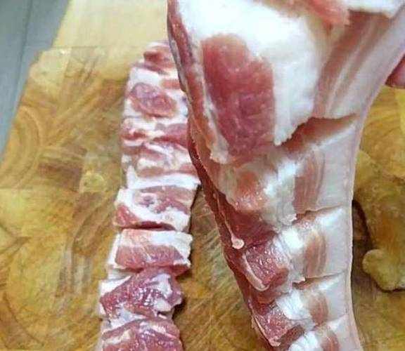 五花肉选择瘦肉相间的,然后切成长条,再改上刀,切成麻辣大小的块,但不能切断。