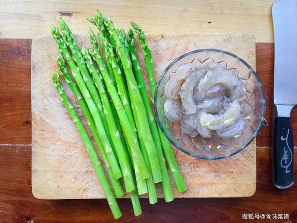 做法如下:先把买来的食材处理一下。芦笋刮掉外皮切成小块,口蘑切片,虾仁去掉头、壳和虾线,晾干水分,加入上述调料腌制。