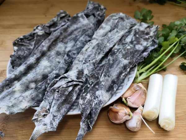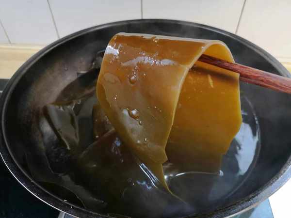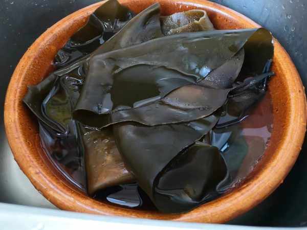 2、需要将海带放凉水中,完全泡透泡软,把海带泡好后,再用水多清洗几遍,把里面的沙子冲洗干净。