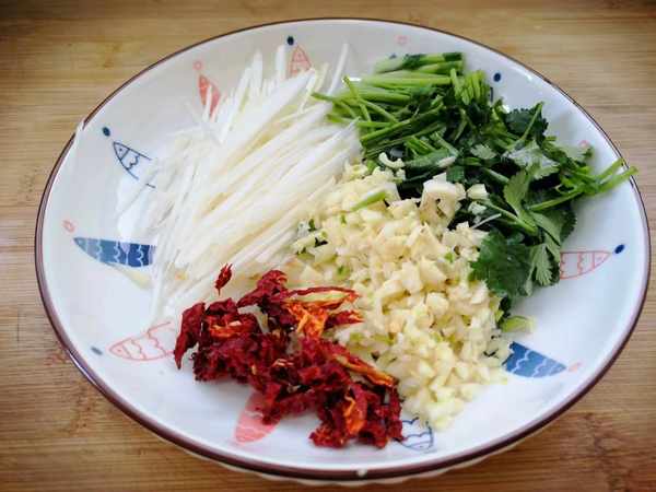 4、香菜洗净切成长段,大蒜,拍扁后切成碎末,葱白切成葱丝,干辣椒用剪刀切成细丝装盘待用,如果喜欢吃辣,可以把干辣椒换成小米椒,切上两根小米椒就可以了。