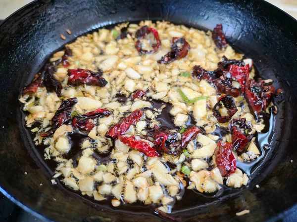 6、锅中加入适量的油,放入少许花椒,炝出香味,然后加入干红辣椒和蒜末爆香,立即关火。