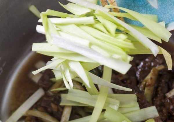 Step2.取一炒锅倒入香油烧热,放入蒜末和葱段爆香,再放牛小排条拌炒均匀,加入韭黄白色段取辣椒丝一起炒香后,关火,下莲藕粉、米酒、蚝油拌匀,放入内锅备用。