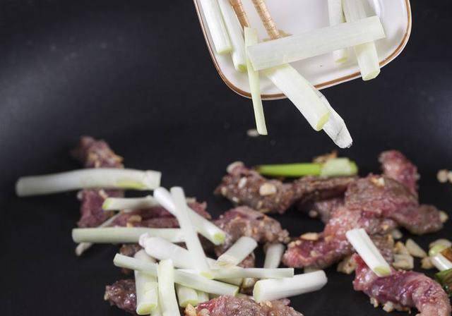 Step1.韭黄根部去除后切段,将黄和白段的部分分开;牛小排切条备用。