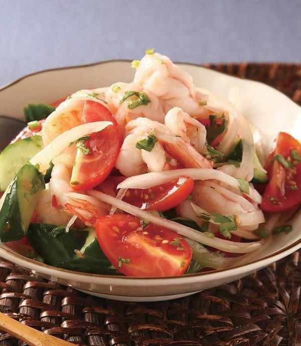 虾仁20克、小番茄10颗、小黄瓜1根、蒜仁2颗、洋葱1/2颗、香菜2根