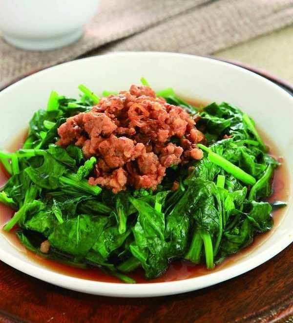 Step4.滚后约10秒再捞出菠菜沥干水分装盘,淋上作法2的肉燥即可。
