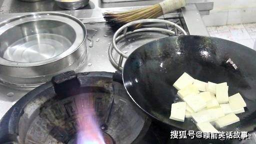2.锅内烧油,烧至冒青烟,滑锅后倒出热油,加入凉油后,再倒入豆腐。这是一个比较重要的窍门,热锅凉油,才能在煎豆腐时,豆腐不会粘锅。