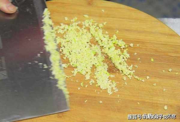 然后切一点蒜末,生熟案子一定要分开,使用切蒜末要用调凉菜的案板,蒜末切好以后放在盆中。