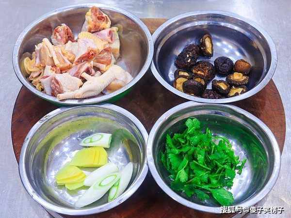 一把干香菇放入清水中泡发去根;半只麻公鸡去除鸡屁股和鸡脚趾,把鸡肉剁成均匀的小块;生姜切成片;大葱切成马蹄片;香菜洗干净切成段备用。
