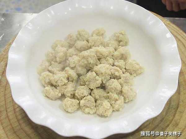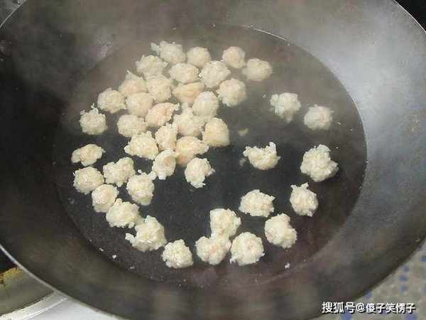 锅内烧水,大火烧开以后关火,肉馅在虎口处挤成丸子,用小勺挖下来放在锅内。丸子不要挤得太大,小一点容易煮熟入味;关火下丸子能防止沸水把丸子冲散,同时还能避免前后下锅的丸子生熟不一致。