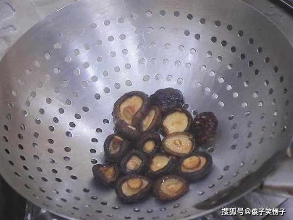 起锅烧水,水开香菇放入水中焯烫30秒钟,然后倒出来冲凉沥水备用。