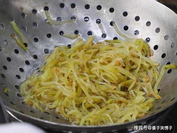 起锅烧水,把水烧开放入切好的榨菜丝,焯水30秒钟捞出,用清水冲洗干净控水,榨菜比较咸可以多煮一会儿冲淡咸味。