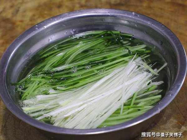 一小块里脊肉切成丝;一块榨菜切成细丝;一把香菜切成段;枸杞一小把,在清水中泡发;一段黄瓜切成细丝,一段大葱白切成细丝和黄瓜放在一起,加入清水浸泡。