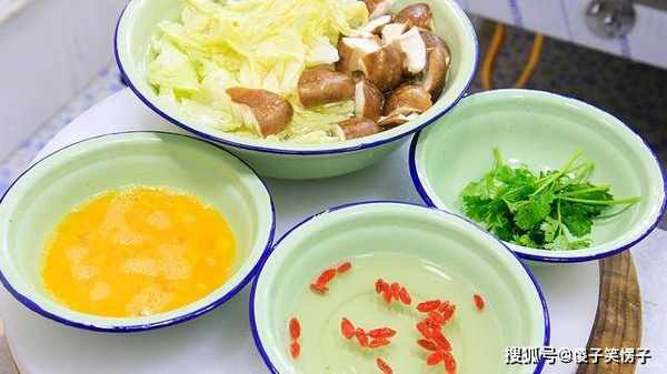一小把枸杞,放入温水中泡发;大白菜切掉根部,把白菜叶撕成小片放入盆中,香菇切成小块,放在一起用清水洗干净;碗中打入三个鸡蛋,加入食盐1克搅拌成蛋液;另外切一点香菜段备用。