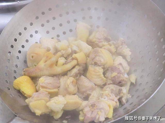 锅内再烧水淋入料酒去腥,冷水放入鸡块煮出鸡块中的血水,水烧开以后打入锅中的浮沫,大约煮两分钟后把鸡块倒出来,用清水冲掉上面的血沫。