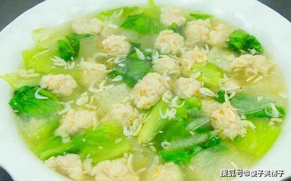 把刚才煮丸子的水烧至沸腾,倒入冬瓜块,加入食盐2克、鸡粉2克,煮2分钟等冬瓜变软以后,倒入生菜叶烫一下出锅和丸子放在一起,再浇上汤汁撒上虾米,再滴上芝麻香油美味即成。
