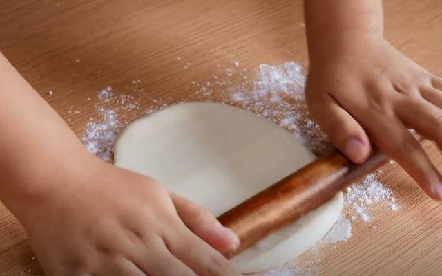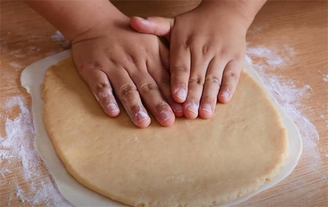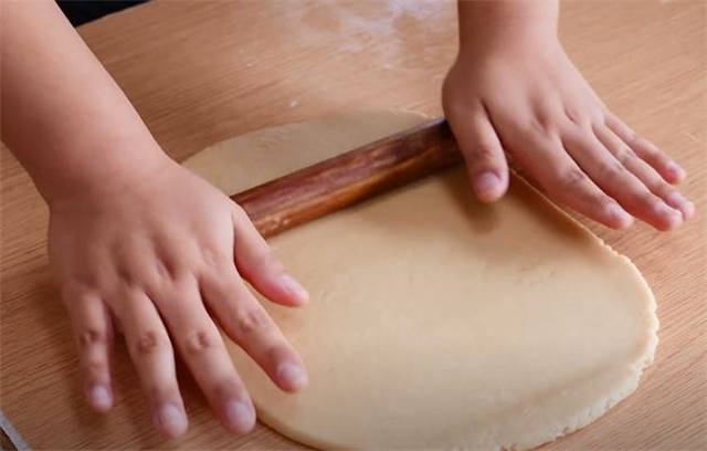 5.现在我们再来处理油皮的部分,案板上撒些干面粉防粘,擀成和酥面同样的大小。